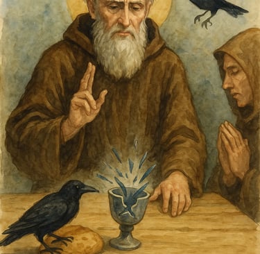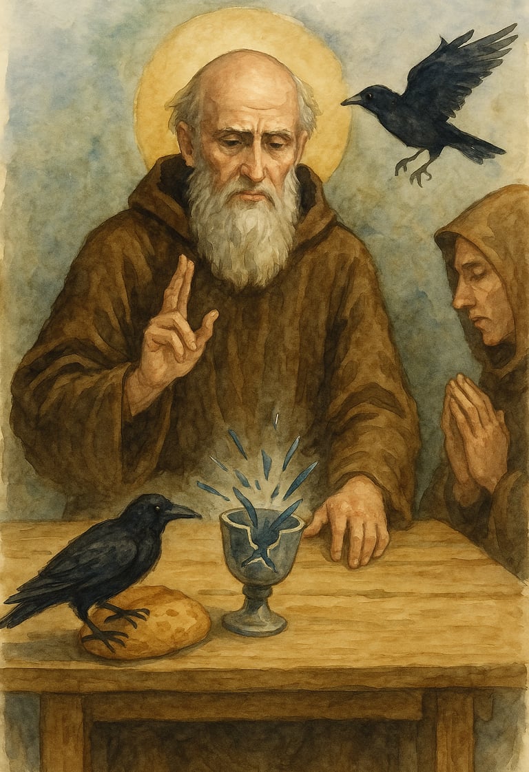 But holiness doesn’t hide for long. Drawn by his sanctity, men came. One community asked Benedict to become their abbot—but when he called them to conversion, they tried to poison him. Legend says he blessed the cup—and it shattered. A raven carried off the poisoned bread. The Cross protected him, and the Church took notice.