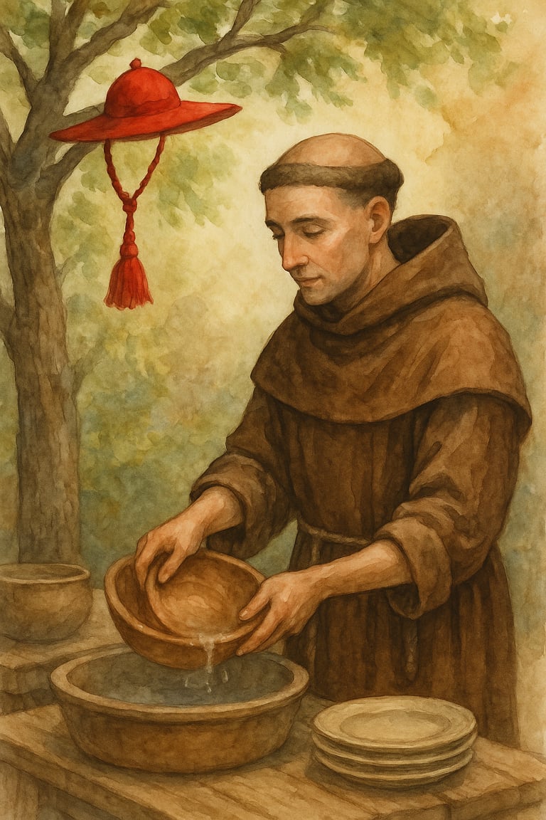 In 1273, Pope Gregory X made him a Cardinal, but when the messengers arrived, they found Bonaventure washing dishes. He told them, “My hands are wet just now. Kindly hang the hat on that tree.”