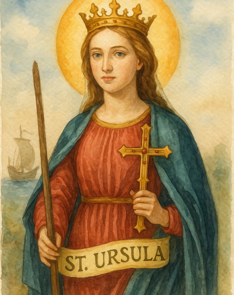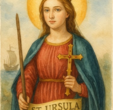 Tradition tells us that Ursula was a British princess, raised in the Christian faith and deeply committed to remaining a virgin for Christ. When a pagan prince sought her hand in marriage, she courageously negotiated a delay, proposing instead a pilgrimage across Europe. Her goal? To strengthen her companions in the faith and deepen their consecration to God.