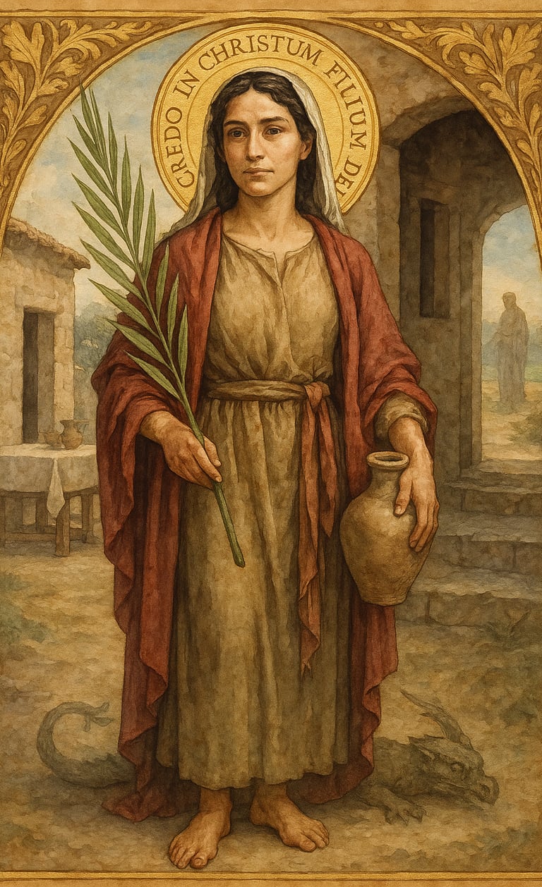 Later traditions tell us that Martha, along with Mary and Lazarus, was cast out of Judea during the early persecutions and found refuge in southern France. There, she continued her life of service, evangelization, and prayer. In one famous legend, she subdued a dragon-like creature known as the Tarasque with nothing but holy water and a cross—symbolizing the triumph of Christian faith over fearsome paganism.