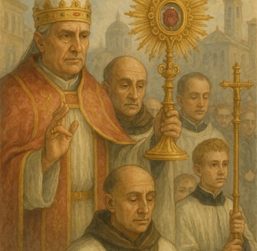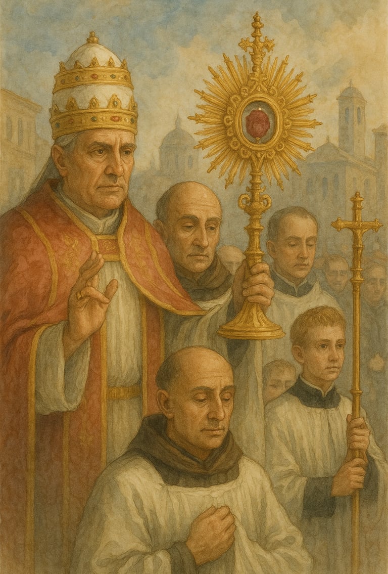 In 1264, Pope Urban IV formally instituted the feast for the universal Church through the papal bull Transiturus de hoc mundo, making Corpus Christi the first feast established universally by papal authority rather than by local devotion. Corpus Christi is Latin for the “Body of Christ.” It is a solemn celebration in the Latin Church that honors the Real Presence of Jesus Christ in the Holy Eucharist—Body, Blood, Soul, and Divinity. The pope commissioned none other than St. Thomas Aquinas to compose the liturgical texts and hymns for the feast. His masterpieces include: Pange Lingua (which contains the beloved Tantum Ergo), Adoro Te Devote, Lauda Sion, and O Salutaris Hostia—all of which reflect deep theological clarity and Eucharistic devotion.